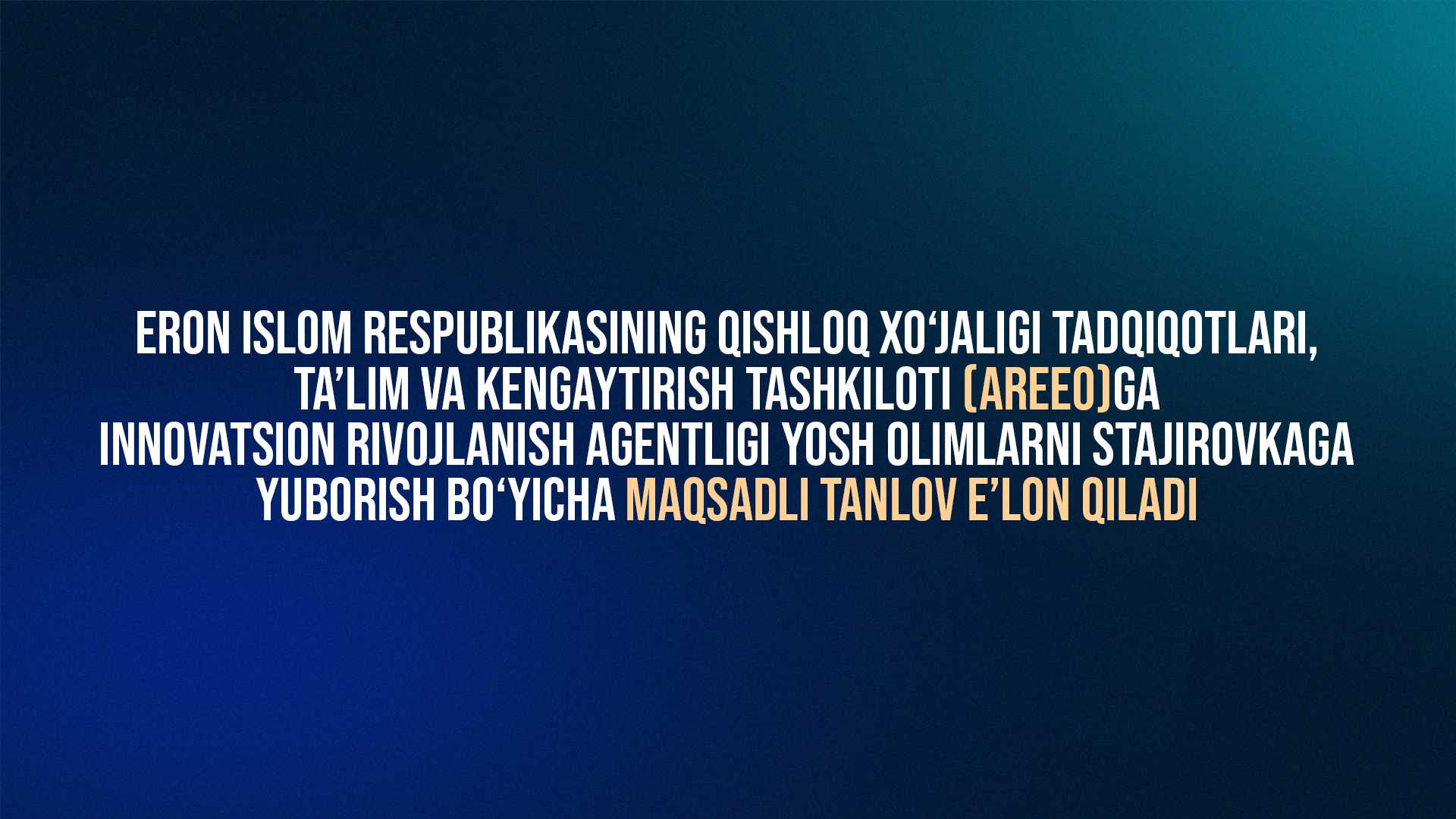 Innovatsion rivojlanish agentligi (Agentlik) O‘zbekiston Respublikasi Prezidentining 2024-yil 25-dekabrdagi PQ-455-son qaroriga 7-ilovasi bilan tasdiqlangan “Birinchi darajali budjet mablag‘larini taqsimlovchilarning 2025-2027-yillar uchun budjet mablag‘laridan foydalanish bilan bog‘liq maqsadli indikatorlari” tegishli bandi ijrosini ta’minlash maqsadida yosh olimlarni xorijiy tashkilotlarga qisqa muddatli ilmiy stajirovkaga (stajirovka) yuborish bo‘yicha maqsadli tanlov e’lon qiladi. Maqsadli tanlov Vazirlar Mahkamasining 2021-yil 19-apreldagi 222-son qarori bilan tasdiqlangan “Yosh olimlarni yetakchi xorijiy ilmiy tashkilotlarga qisqa muddatli ilmiy stajirovkalarga yuborish tartibi to‘g‘risida” nizom (Nizom) talablariga va Eron Islom Respublikasining Qishloq xo‘jaligi tadqiqotlari, ta’lim va kengaytirish tashkiloti (AREEO) bilan tuzilgan kelishuv bitimiga asosan tashkil etiladi. Bunda, stajirovka o‘tash uchun 20 nafar yosh olim saralab olinadi va tanlov g‘oliblari e’lon matniga 1-ilovada keltirilgan stajirovkani amalga oshirish dasturlarida belgilangan vazifalarni bajarish uchun Eron Islom Respublikasining Qishloq xo‘jaligi tadqiqotlari, ta’lim va kengaytirish tashkiloti (AREEO)ga 2025-yil davomida 1-ilovada keltirilgan muddatlarda stajirovkaga yuboriladi. Shunga ko‘ra, Oliy ta’lim muassasalari va ilmiy tashkilotlar (buyurtmachilar) tomonidan stajirovka o‘tashga tavsiya qilinuvchi (ehtiyoji mavjud) nomzodlar to‘g‘risidagi ma’lumot (hujjat)lar e’lon matniga 2-ilovaga muvofiq Nizom talablari asosida 2025-yilning 31-may (mazkur sanada ham qabul qilinadi) sanasiga qadar faqatgina “internship.ilmiy.uz” xorijiy ilmiy stajirovkalarni tashkil etishning yagona elektron tizimi orqali taqdim etiladilar. Ma’lumot uchun. Boshqa elektron manzil (edo.ijro.uz, exat, Agentlik va Vazirliklarning rasmiy elektron pochta manzillari va xk.) va/yoki Agentlik mas’ul xodimlarining rasmiy elektron pochta manzillari orqali kelib tushgan nomzodlar to‘g‘risidagi ma’lumot (hujjat)lar qabul qilinmaydi va ko‘rib chiqilmaydi. Nomzodlarni tavsiya etish jarayonining holisligini va taqdim etilayotgan ma’lumot (hujjat)larning to‘liqligi, haqqoniyligi shu bilan birga, tavsiya etilgan nomzodlarni saralash tanlovlarda ishtirokini ta’minlash buyurtmachi rahbari zimmasiga yuklanadi. Tanlov haqida qo‘shimcha ma’lumotlar olish uchun Agentlik mas’ul xodimlari: Ilmiy stajirovkalarni va laboratoriya asbob-uskunalari xaridini tashkil etish bo‘limi boshlig‘i Taxirov Sarvarbek Matchanovich, telefon: (71) 203 32 23 (ichki raqam 655), elektron manzil: s.takhirov@ilmiy.uz; Bosh mutaxassis Kabashev Toirjon Perdebaevich, telefon: (71) 203 32 23 (ichki raqam 656), elektron manzil: t.kabashev@ilmiy.uz.Axborot tizimiga texnik tomondan qo‘llab qo‘vatlash uchun mas’ul AKTni joriy etish va raqamlashtirish boshqarmasi bosh mutaxassisi Tojiyev Sardor Azimqul o‘g‘li, telefon: (71) 203 32 23 (ichki raqam 647), elektron manzil: s.tojiyev@ilmiy.uz.Tanlov bo‘yicha nomzodlarga yordam berish maqsadida tashkil qilingan telegram guruh: https://t.me/+N0NOgxR6HCA1Y2Ri