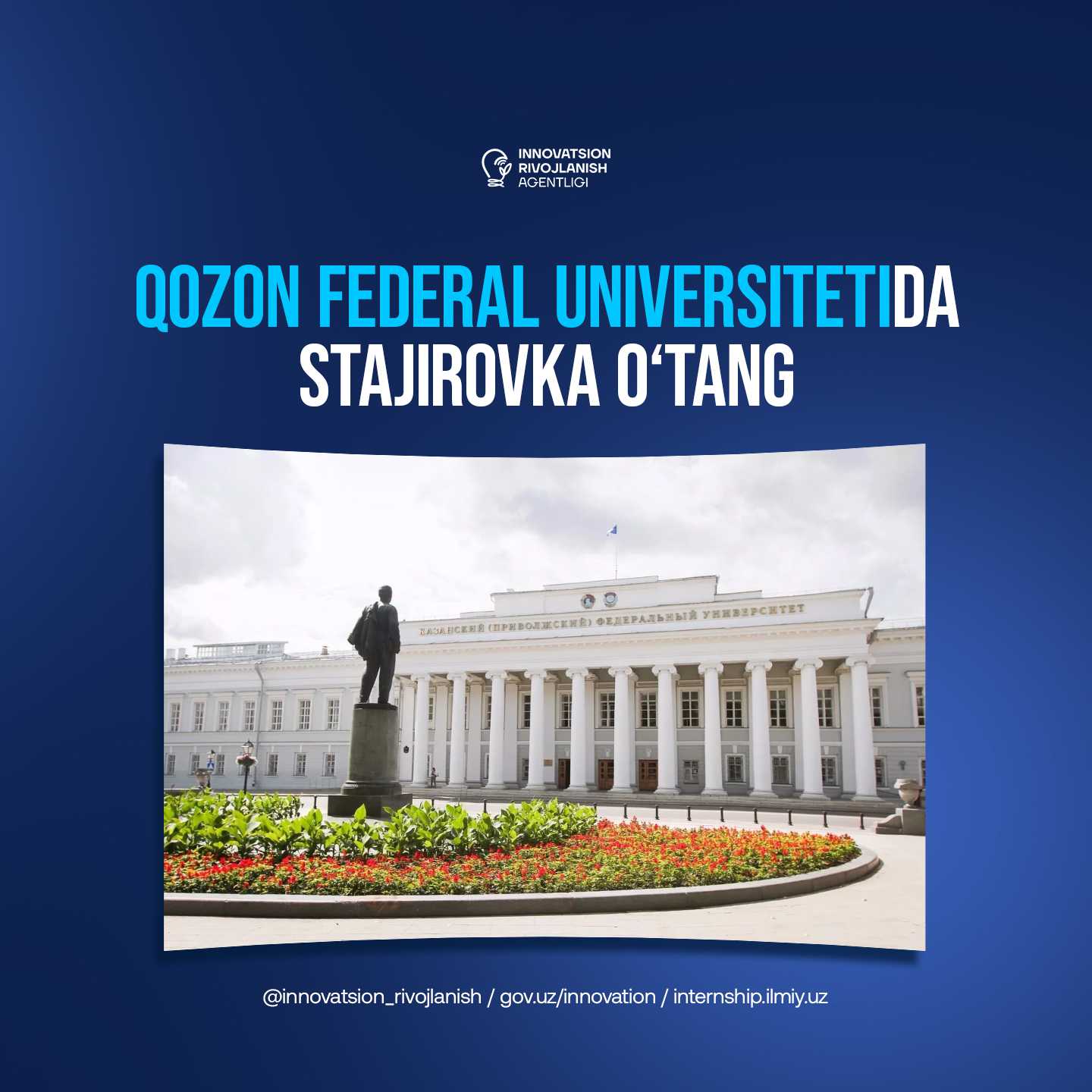 Innovatsion rivojlanish agentligi (Agentlik) O‘zbekiston Respublikasi Prezidentining 2024-yil 25-dekabrdagi PQ-455-son qaroriga 7-ilovasi bilan tasdiqlangan “Birinchi darajali budjet mablag‘larini taqsimlovchilarning 2025-2027-yillar uchun budjet mablag‘laridan foydalanish bilan bog‘liq maqsadli indikatorlari” tegishli bandi hamda Oliy ta’lim, fan va innovatsiyalar vazirining joriy yil 28-apreldagi 3/7-137-son topshirig‘i ijrosini ta’minlash maqsadida yosh olimlarni xorijiy tashkilotlarga qisqa muddatli ilmiy stajirovkaga (stajirovka) yuborish bo‘yicha maqsadli tanlov e’lon qiladi. Maqsadli tanlov Vazirlar Mahkamasining 2021-yil 19-apreldagi 222-son qarori bilan tasdiqlangan “Yosh olimlarni yetakchi xorijiy ilmiy tashkilotlarga qisqa muddatli ilmiy stajirovkalarga yuborish tartibi to‘g‘risida” nizom (Nizom) talablariga va Tatariston Respublikasining Qozon Federal universiteti bilan tuzilgan kelishuv bitimiga asosan tashkil etiladi. Bunda, stajirovka o‘tash uchun yo‘nalishlar taqsimotida keltirilgan miqdorlarda yosh olim saralab olinadiva tanlov g‘oliblari e’lon matniga 1-ilovada keltirilgan stajirovkani amalga oshirish dasturlarida belgilangan vazifalarni bajarish uchun Tatariston Respublikasining Qozon Federal universitetiga 2026-yil davomida 1 oylik stajirovkaga yuboriladi. Shunga ko‘ra, Oliy ta’lim muassasalari va ilmiy tashkilotlar (buyurtmachilar) tomonidan stajirovka o‘tashga tavsiya qilinuvchi (ehtiyoji mavjud) nomzodlar to‘g‘risidagi ma’lumot (hujjat)lar e’lon matniga 2-ilovaga muvofiq Nizom talablari asosida 2025-yilning 1-dekabr sanasidan 2026-yilning 16-fevral (mazkur sanada ham qabul qilinadi) sanasiga qadar faqatgina “internship.ilmiy.uz” xorijiy ilmiy stajirovkalarni tashkil etishning yagona elektron tizimi orqali taqdim etiladilar. Ma’lumot uchun. Boshqa elektron manzil (edo.ijro.uz, exat, Agentlik va Vazirliklarning rasmiy elektron pochta manzillari va h.k.) va/yoki Agentlik mas’ul xodimlarining rasmiy elektron pochta manzillari orqali kelib tushgan nomzodlar to‘g‘risidagi ma’lumot (hujjat)lar qabul qilinmaydi va ko‘rib chiqilmaydi. Nomzodlarni tavsiya etish jarayonining holisligini va taqdim etilayotgan ma’lumot (hujjat)larning to‘liqligi, haqqoniyligi shu bilan birga, tavsiya etilgan nomzodlarni saralash tanlovlarda ishtirokini ta’minlash buyurtmachi rahbari zimmasiga yuklanadi. Tanlov haqida qo‘shimcha ma’lumotlar olish uchun Agentlik mas’ul xodimlari: Ilmiy tadqiqot faoliyatini muvofiqlashtirish bo‘limi boshlig‘i Shamuratov Baxtiyar Aytbaevich, telefon: (71) 203 32 23 (ichki raqam 245), elektron manzil: b.shamuratov@ilmiy.uz;Axborot tizimiga texnik tomondan qo‘llab-quvvatlash uchun mas’ul AKTni joriy etish va raqamlashtirish boshqarmasi bosh mutaxassisi Tojiyev Sardor Azimqul o‘g‘li, telefon: (71) 203 32 23 (ichki raqam 647), elektron manzil: s.tojiyev@ilmiy.uz. Tanlov bo‘yicha nomzodlarga yordam berish maqsadida tashkil qilingan telegram guruh: https://t.me/+FsubRUjrH-I5ZGVi