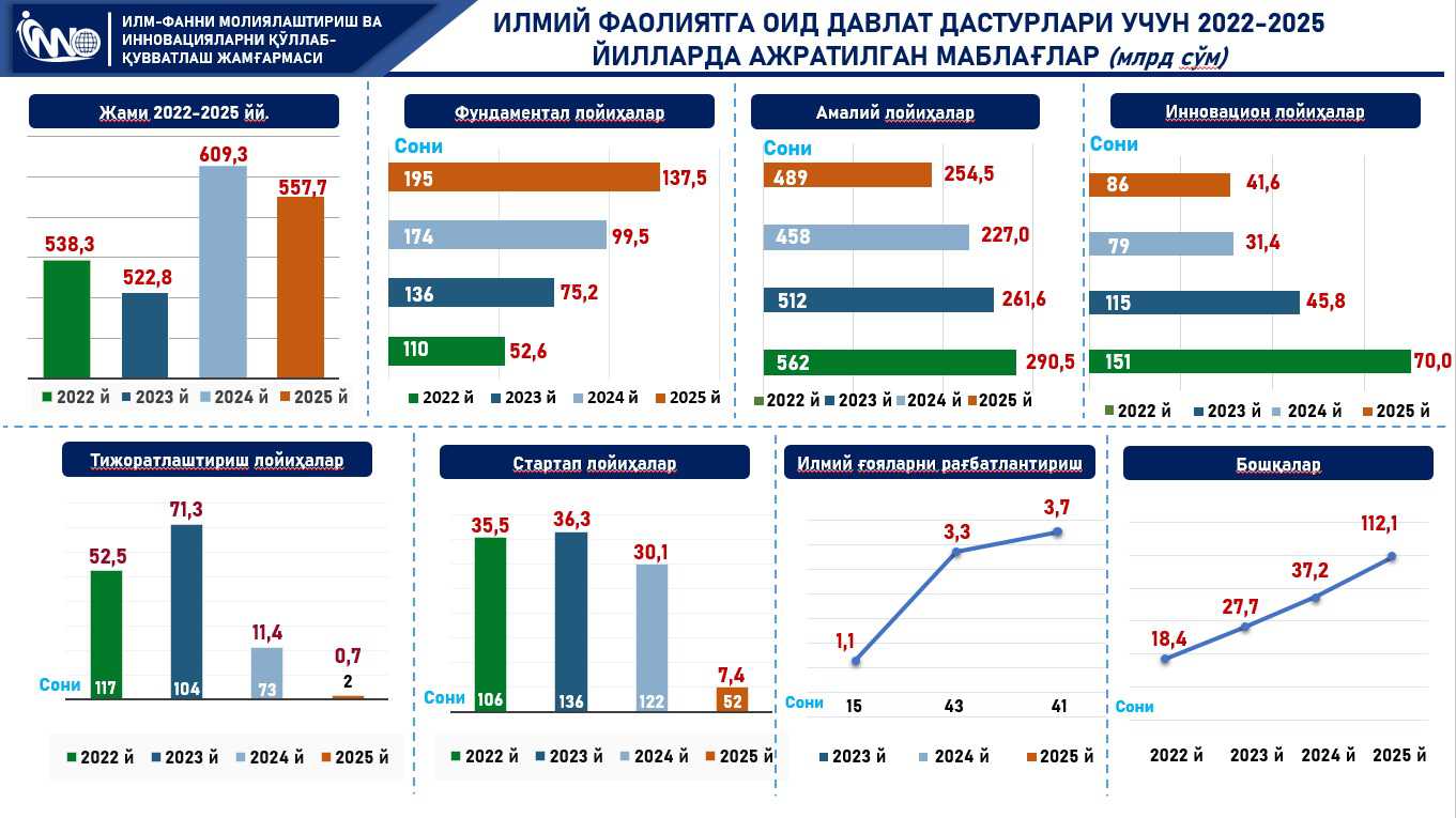 Ilmiy faoliyatga oid davlat dasturlari uchun 2022-2025-yillarda ajratilgan mablagʻlar (mlrd soʻm)